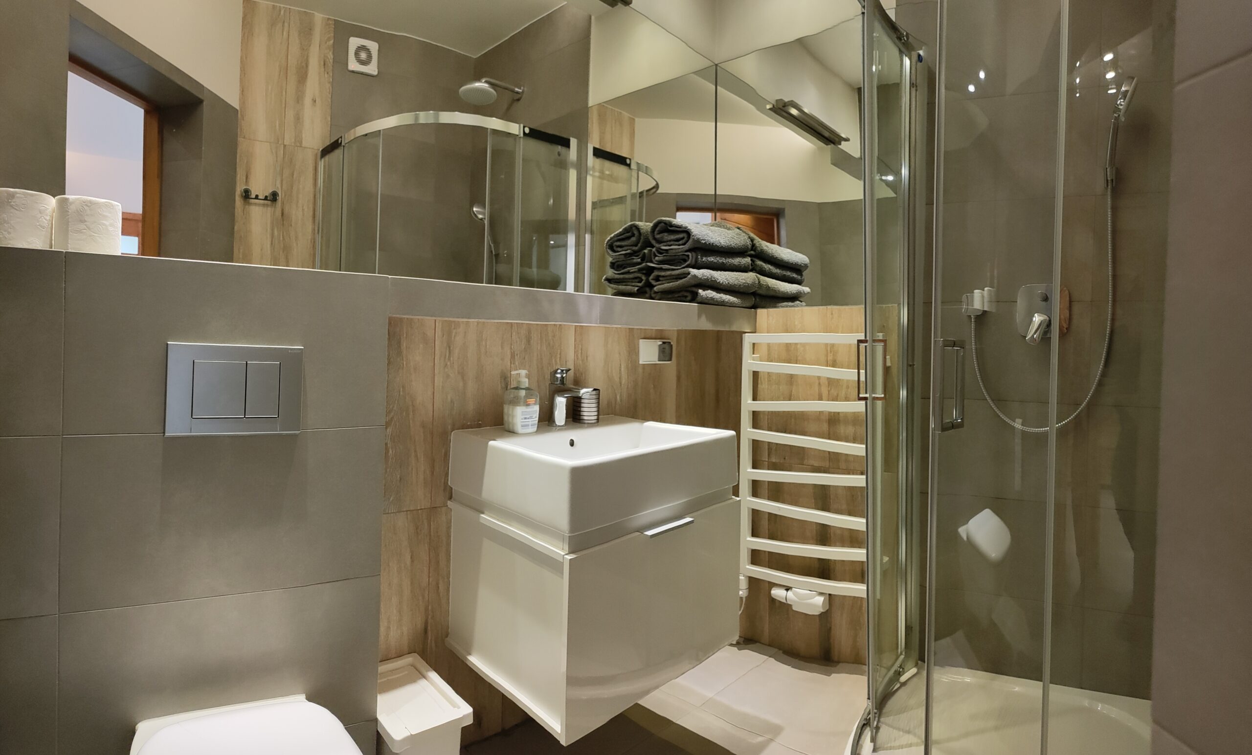 sprchový kout, umyvadlo, WC, vysoušeč vlasů, přídavné topení